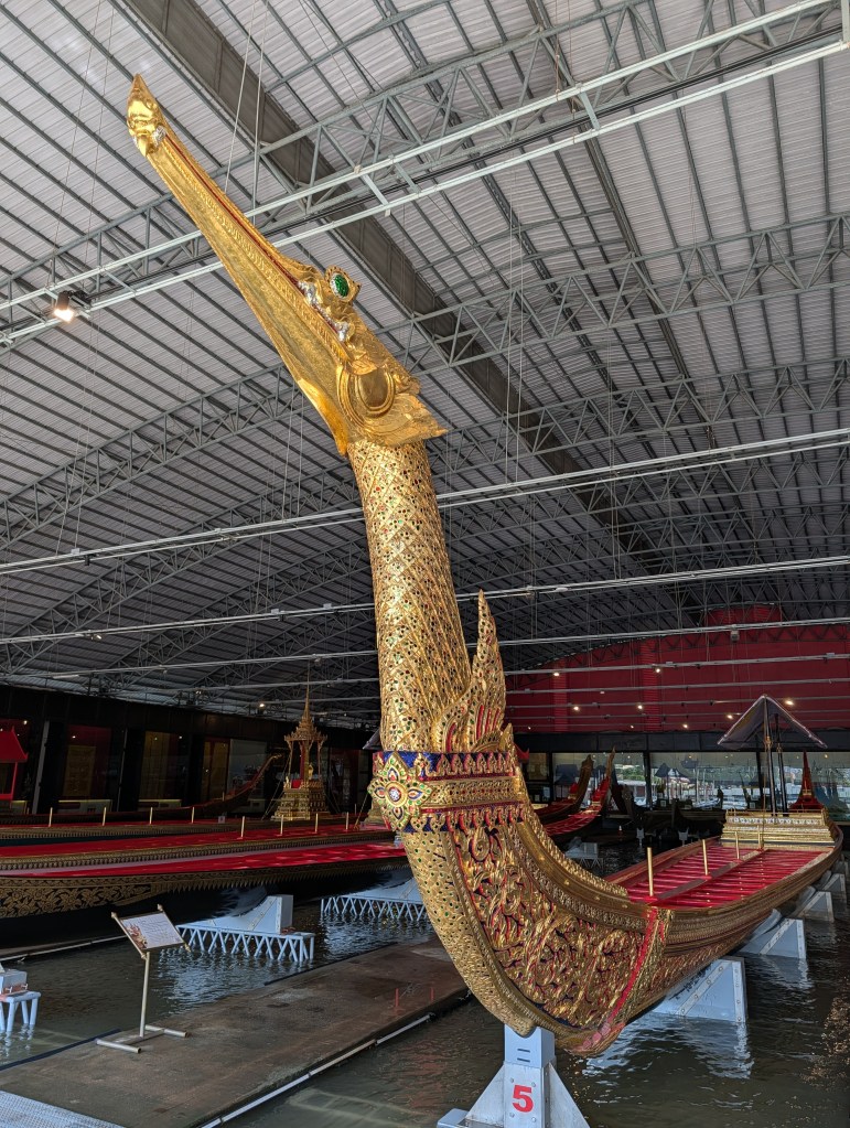 Our cruise ended at the Royal Barges National Museum, located just where the Bangkok Noi river meets the Chao Phraya. This is where the fancy ceremonial barges used by the Royal Family are kept. These barges are about as old as I am. The originals, dating back to the 19th century, took a stray bomb during World War II (the Thonburi railroad station is nearby) and weren’t reconstructed for a couple of decades. They’re lovely to look at, and it would be great to attend one of the festivals when they get put in the water.