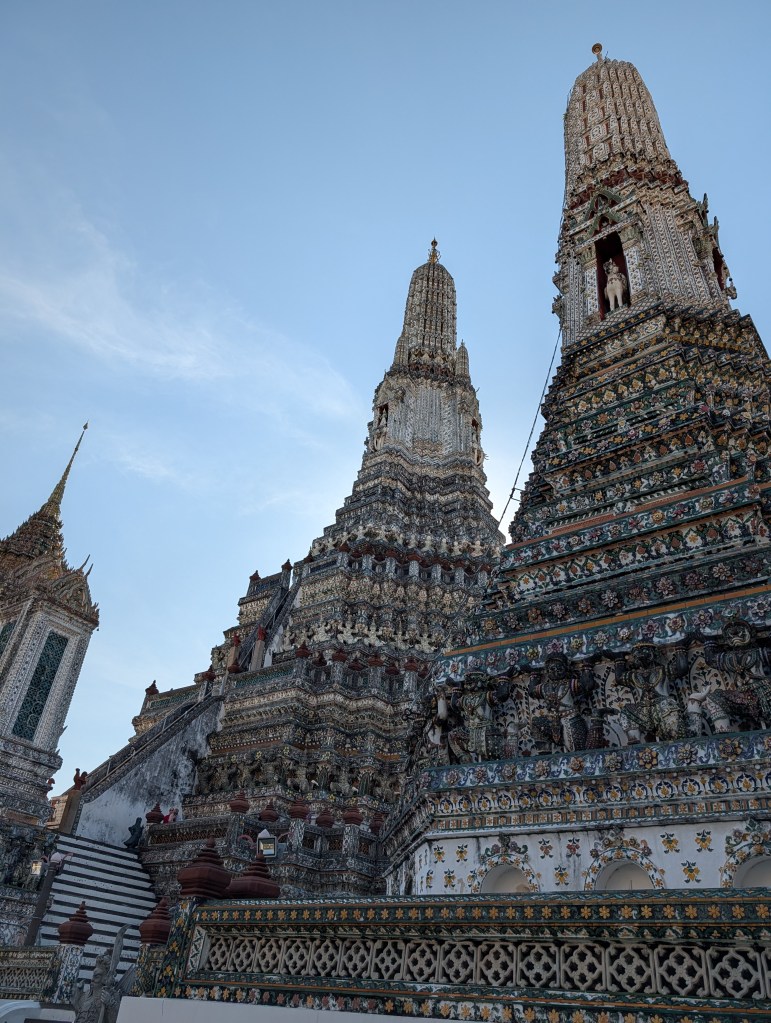 January 6 was another lovely day, though not quite as busy. We rode aboard the Party Van to the west bank of the Chao Phraya river for a visit to the Wat Arun temple complex in the Thonburi district. Wat Arun can be translated as “Temple of Dawn” and sits just across the river from the palace.