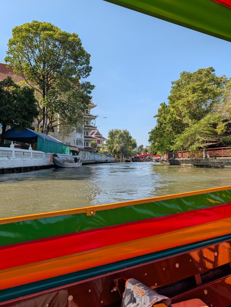 We boarded a “long tail” boat at Wat Arun for a cruise around the canals of Thonburi. Long tail boats are curious hybrids — a long narrow hull with a high prow, obviously originally designed for multiple rowers, but propulsion is a small car engine mounted on a pivot with the propellor shaft sticking straight out behind for ten or twelve feet. The boatman can steer by turning the motor, or lift the prop out of the water in shallow areas. Our guide said they are sometimes called “James Bond boats” because Roger Moore got to zip around in one in The Man With the Golden Gun.