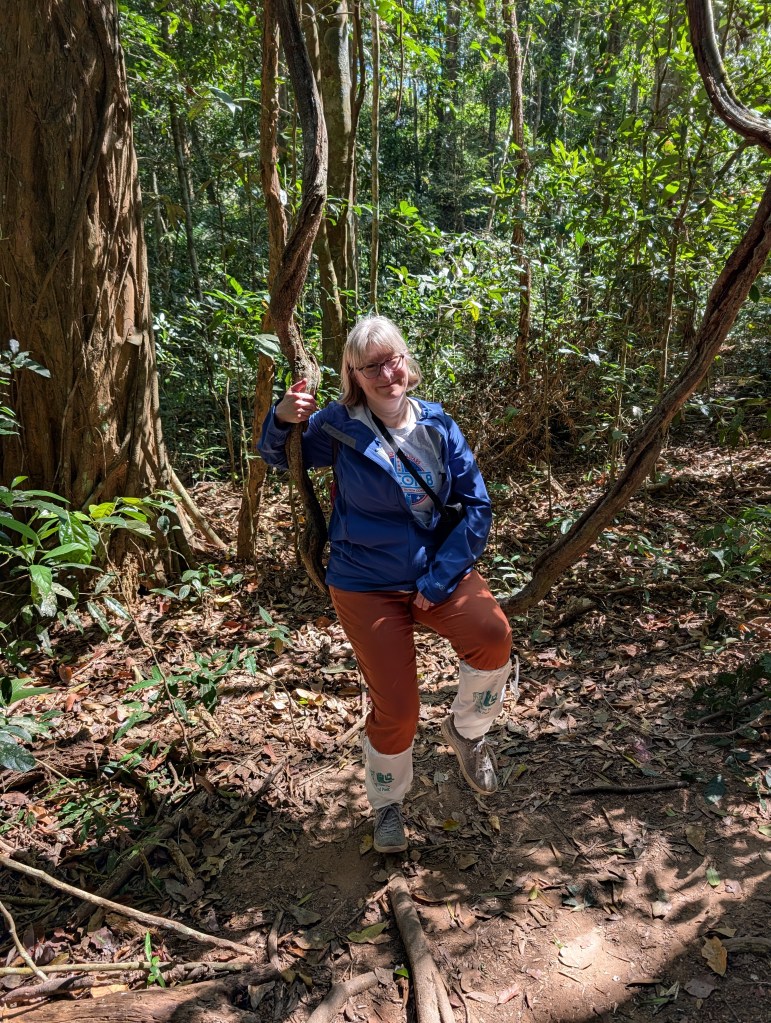 But before setting out on the trail we had to put on some protective gear: sort of drawstring-topped gaiters covering our legs below the knees. Why? Ground leeches! Apparently they can crawl surprisingly fast, and can get up under the legs of your trousers before latching on. I didn’t see any, and thanks to the leech stockings, none of them got me. (I think they are more common in the rainy season.)