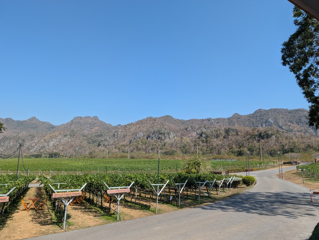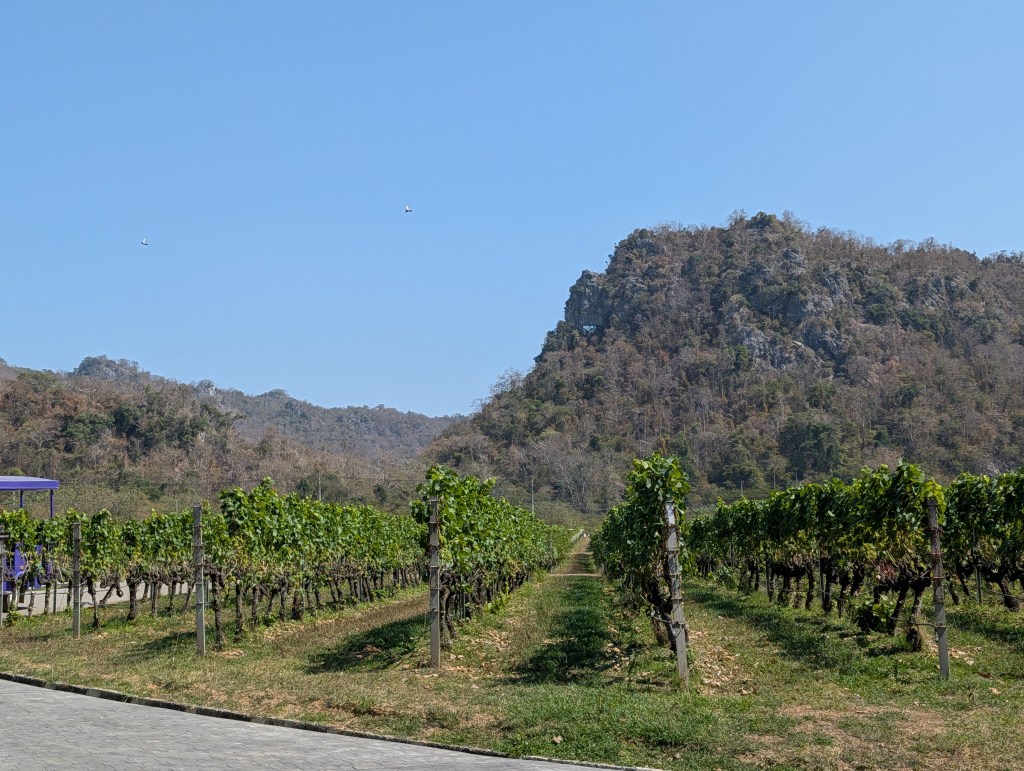 It might seem odd to have a vineyard in the heart of Thailand, but the reason is simple: limestone. Turns out the Khao Yai mountains are pretty similar, geologically, to places like southern France, northern Italy, and California. Plus in Thailand there’s no frost to worry about. Apparently they deliberately prune back the vines in order to get only one crop of grapes per year — the rainy-season grapes aren’t really good for wine.