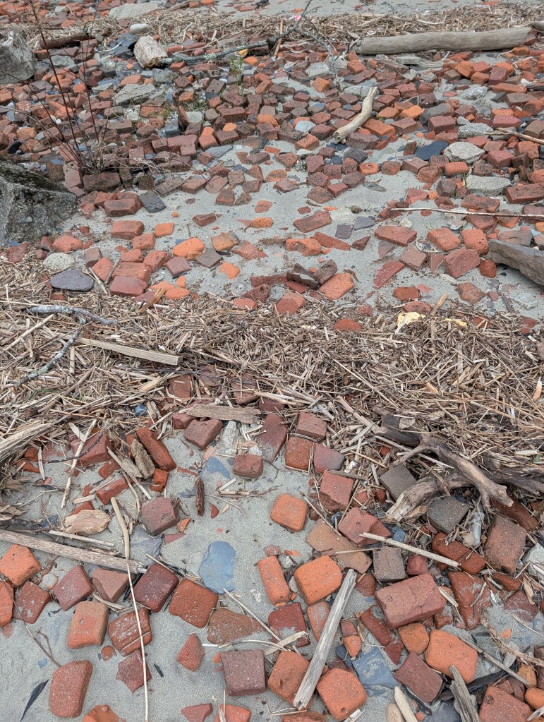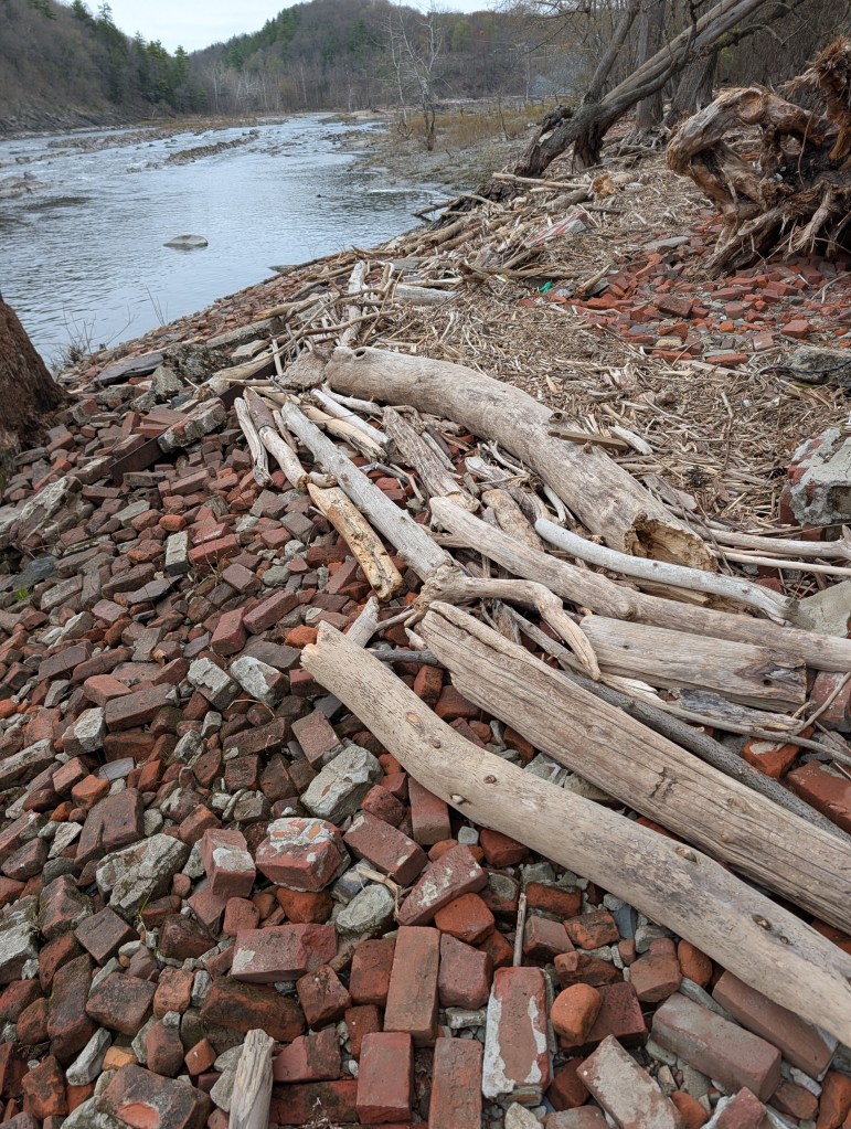 I know my taste for this kind of thing is distinctly idiosyncratic. Probably very few people would have been delighted to find a bunch of water-rounded bricks and driftwood along a river, but if you are one of them, I hope you enjoy these images.
